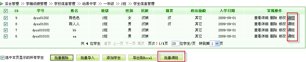 在學(xué)校中,學(xué)生可能會因為多種情況而需要調(diào)班或者轉(zhuǎn)班,為了切合這一實際需求,3.0學(xué)校版新增了給學(xué)生調(diào)班的功能,可以將學(xué)生相關(guān)信息從當(dāng)前班級轉(zhuǎn)到其他班級。此外,系統(tǒng)還提供了批量調(diào)班的功能,可以便捷地實現(xiàn)多個學(xué)生的一次性調(diào)班操作。