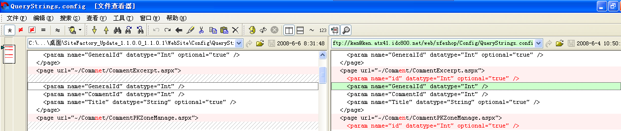 2、對紅色的差異文件QueryStrings.config,雙擊打開文件查看器,進(jìn)行逐行對比覆蓋或編輯。點(diǎn)擊“紅色的不等號”的按鈕可以只顯示有差異的代碼行。如果我們曾經(jīng)編輯過ftp里的QueryStrings.config文件,并且想保留我們增加或修改的代碼,那么我們可不對該代碼進(jìn)行覆蓋修改。